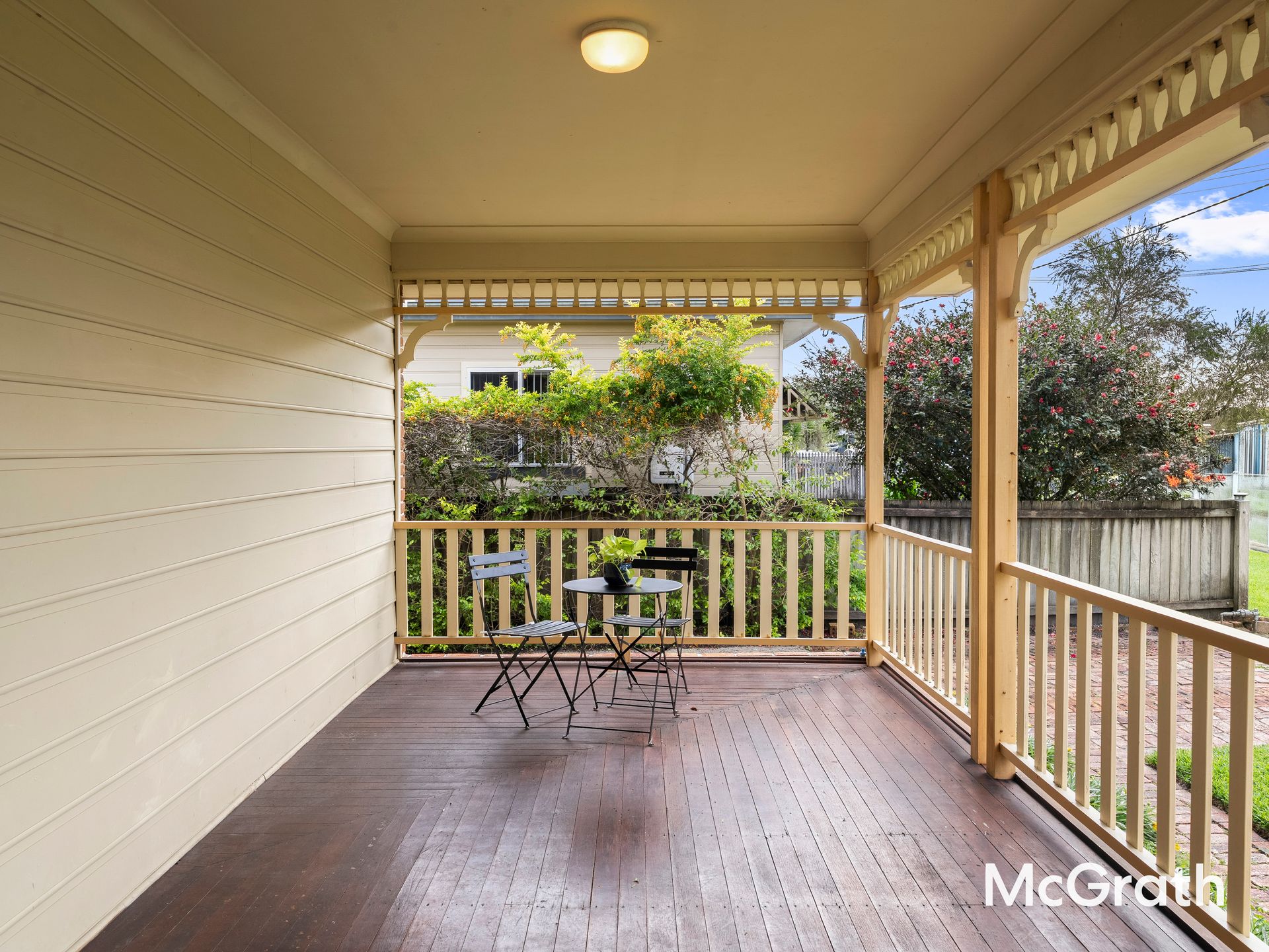 A sunny rear verandah that overlooks the lush garden—ideal for reading, outdoor dining, or simply relaxing under the mango tree