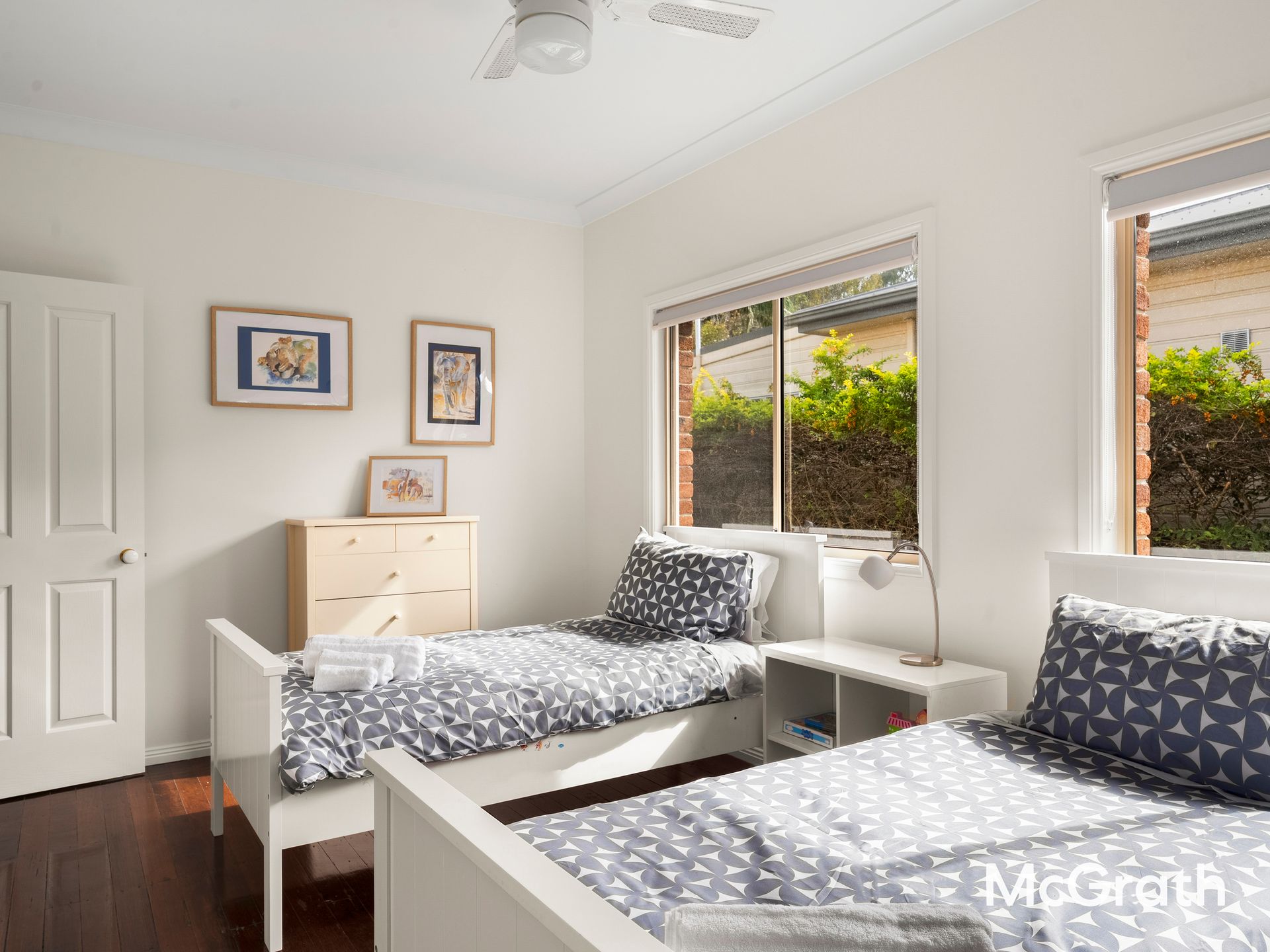 Bedroom 3: Two single beds and a ceiling fan – ideal for children or friends