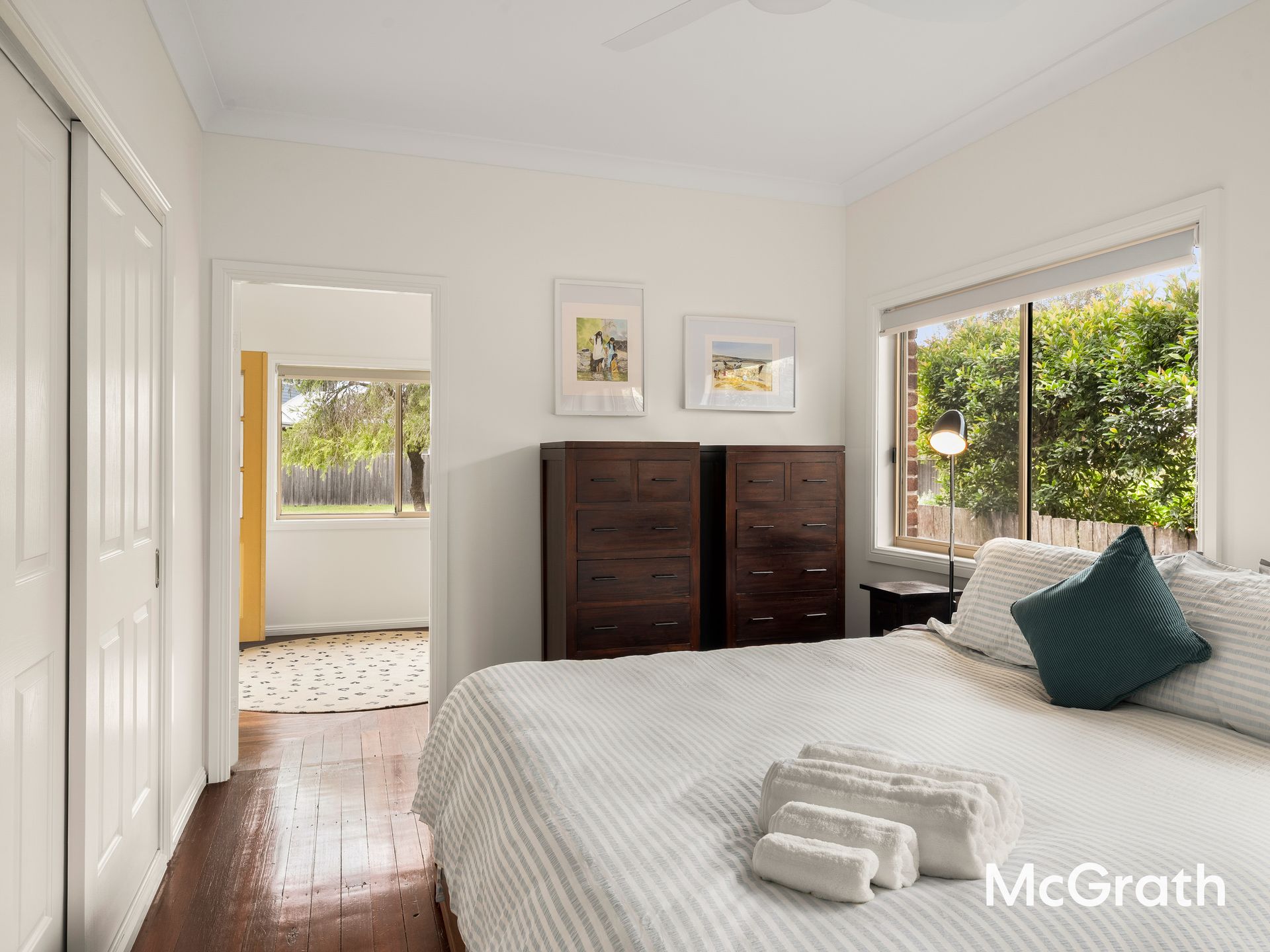 Bedroom 1: Queen bed, ceiling fan – light-filled and perfect for couples.