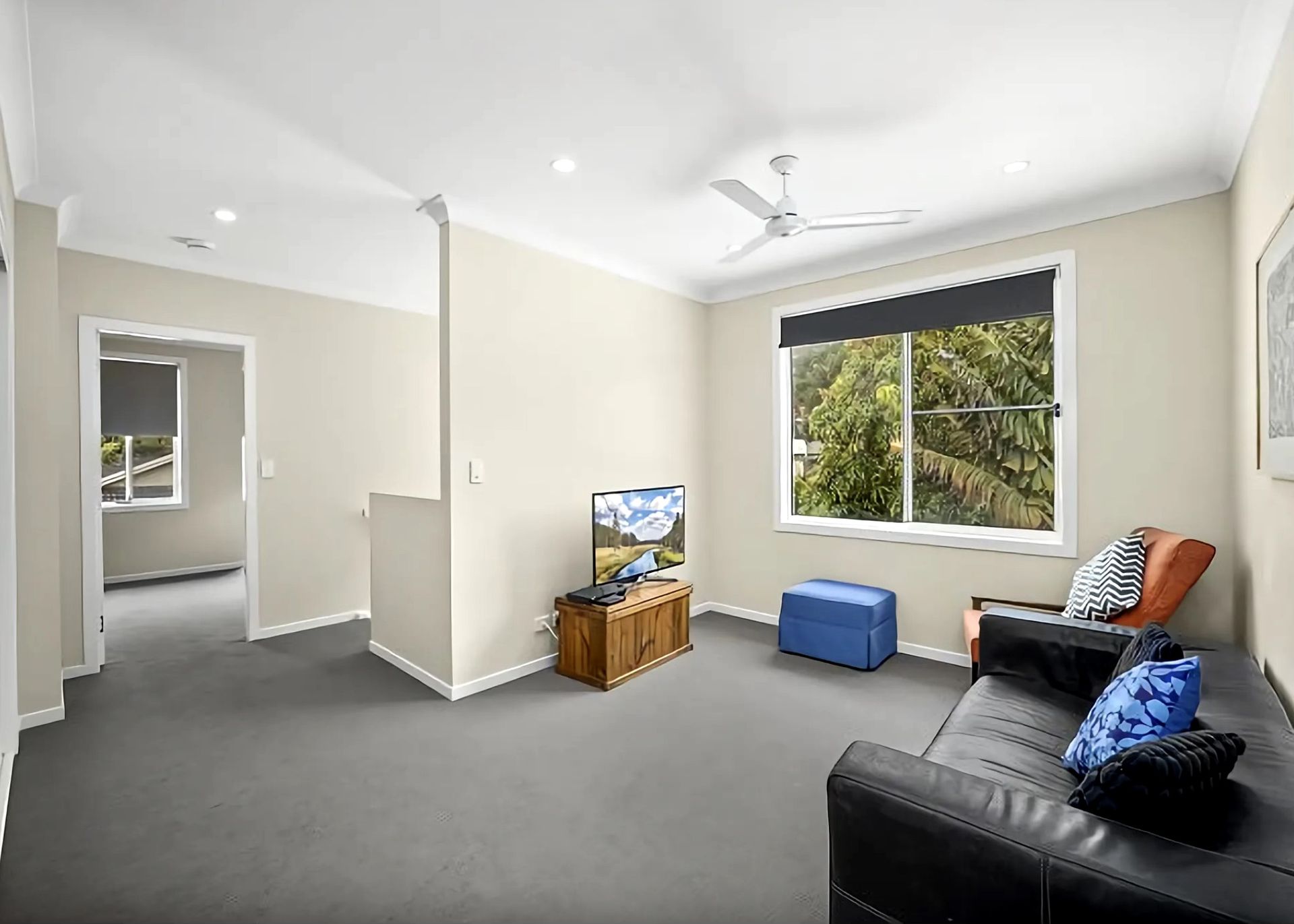 Upstairs, you'll find three more bedrooms and a second living space. The master suite includes a king bed, walk-in robe, and ensuite. The remaining bedrooms have built-in robes, and a family bathroom with a bath completes the upper level.